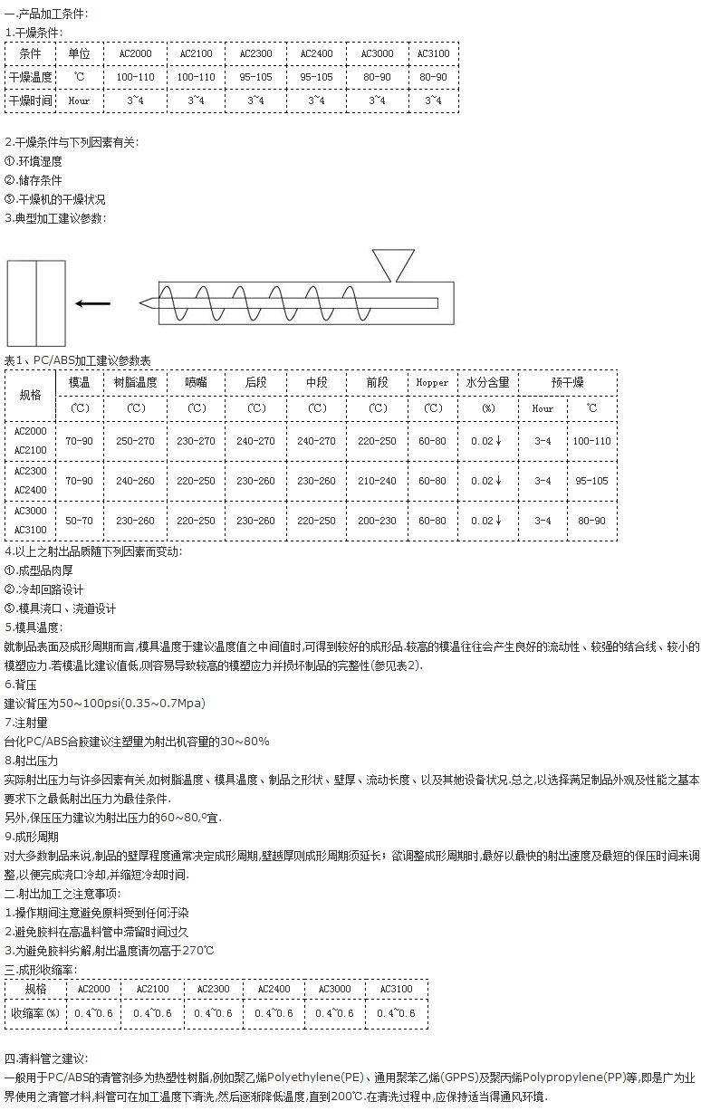 臺灣臺化PC_ABS合金塑料樹脂加工參數(shù)