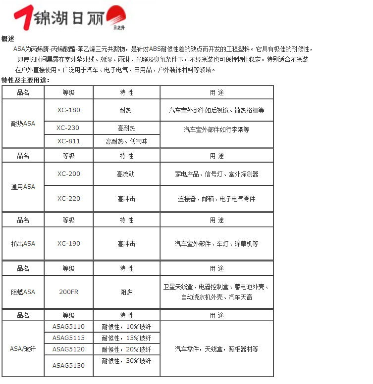 丙烯腈-丙烯酸酯-苯乙烯三元共聚物ASA-韓國錦湖產品特性及主要用途